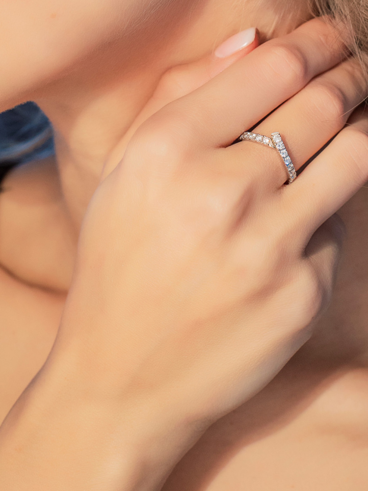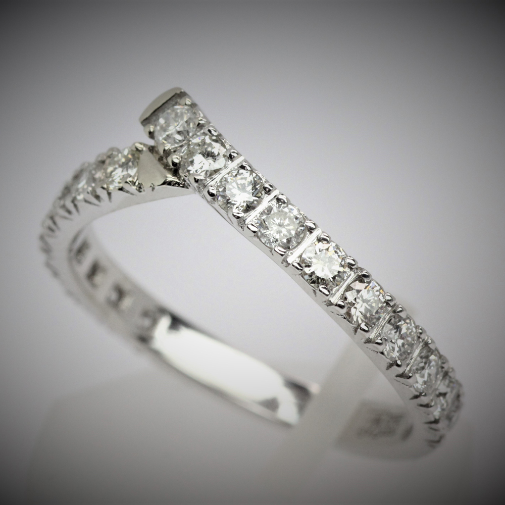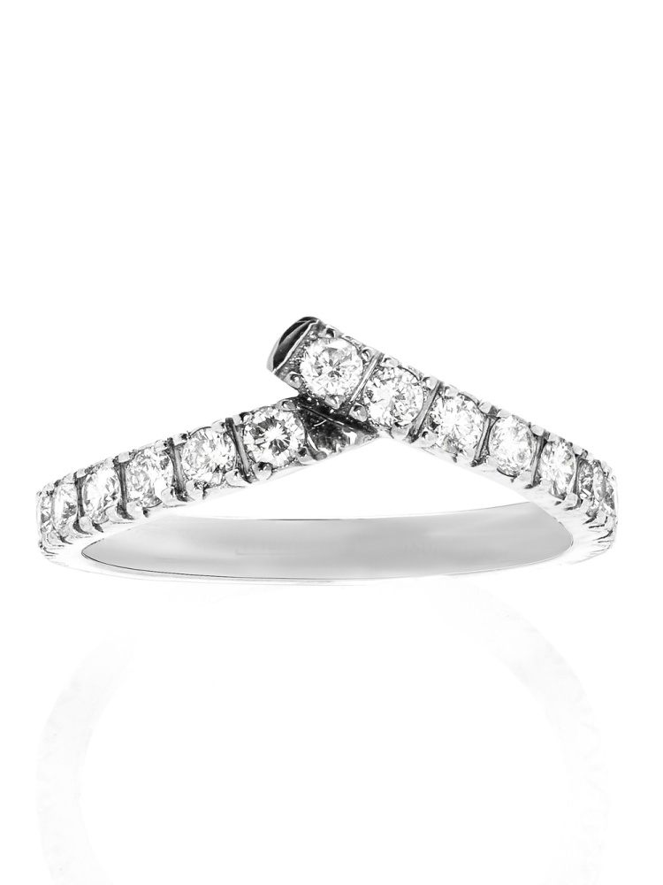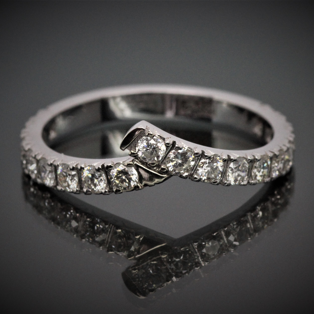 Нежное и сверкающее кольцо оригинальной формы из белого золота с бриллиантами. Золото 585, вес кольца - около 2,0 г, 18 бриллиантов Кр-57 - 0,58 кар - 3/5А. Масса украшения и вес вставок в разных экземплярах могут варьироваться в незначительных пределах.