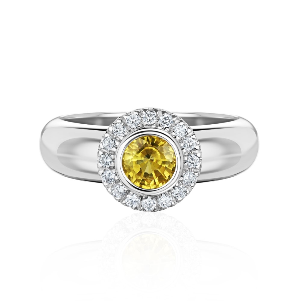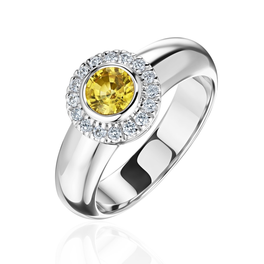 Восхитительный ярко-желтый желтый сапфир в обрамлении белоснежных бриллиантов в нашей популярной модели кольца из белого золота. Замечательное сочетание желтого сапфира круглой огранки, играющих бриллиантов, широких плавных линий кольца делают это украшение необыкновенно эффектным и нарядным. Кольцо изготовлено из белого золота 585 пробы. Вес кольца - 5,2 г. Масса желтого сапфира - около 0,7 карата. Желтый сапфир - природный, облагороженный. 16 Бриллиантов Кр-57 - 0,17 карата, характеристики камней 3/5А. Масса украшения и вес вставок в разных экземплярах могут варьироваться в незначительных пределах.