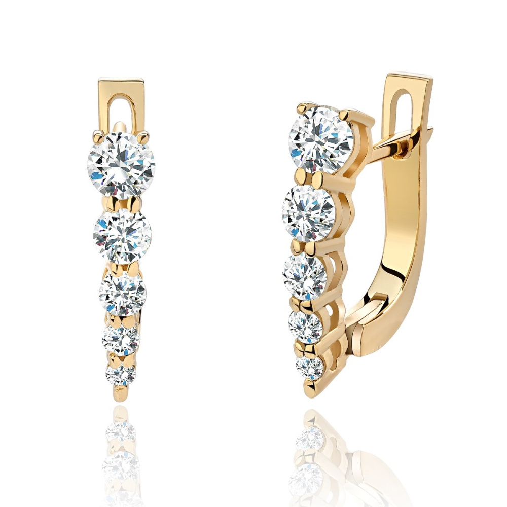 Элегантные, легкие, но в тоже время строгие и сияющие серьги "дорожки" из желтого золота с бриллиантами. Бесцветные бриллианты высокого качества подобраны от более крупного камня к мелким. Это придает дополнительный объем и очень эффектно смотрится. Вес украшения - 1,6 г. Желтое золото 585 пробы. Бриллианты Кр-57 10 шт. 0,57 кар 4/5А.