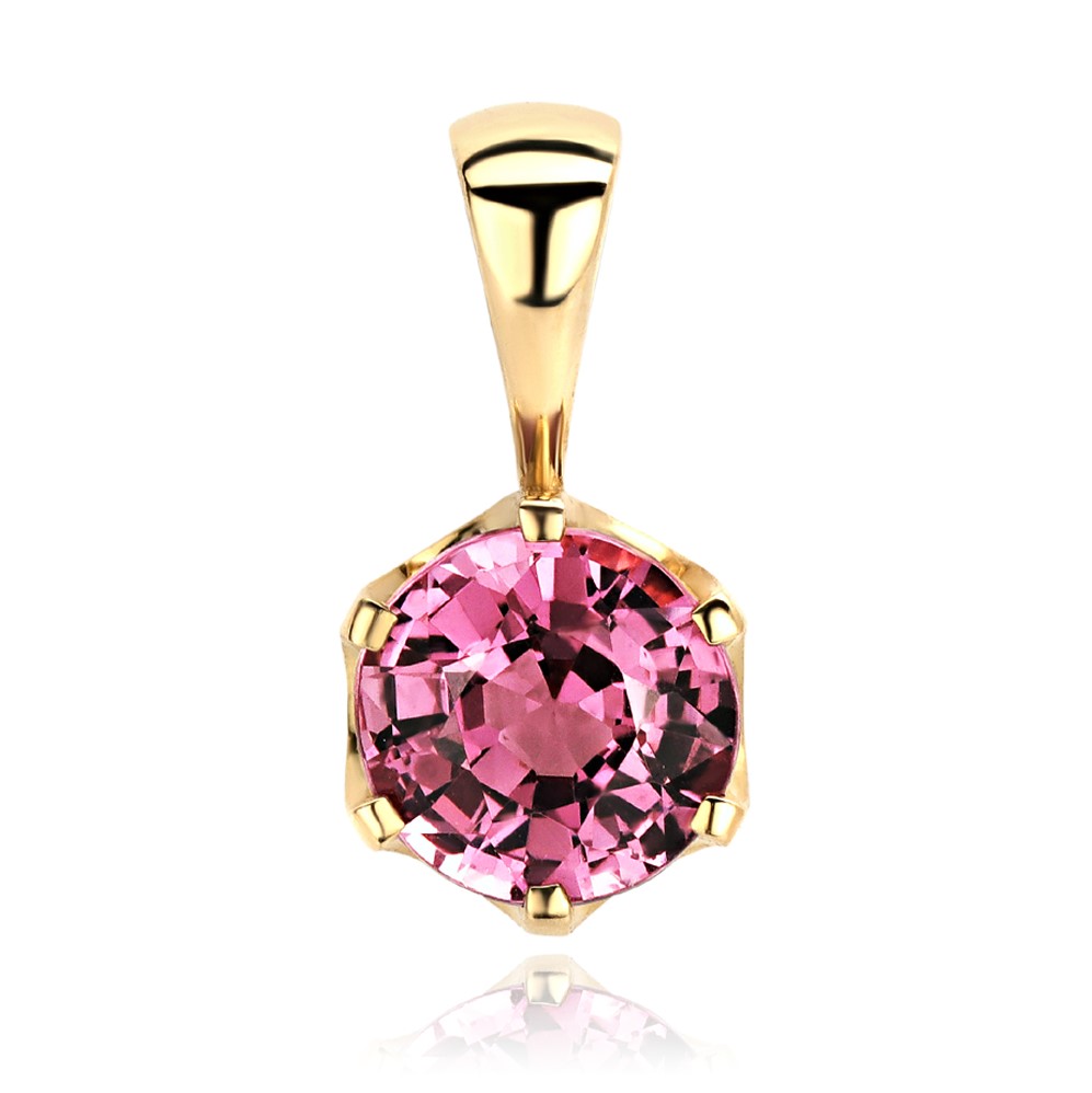 Подвеска из желтого золота традиционного дизайна с натуральной шпинелью насыщенного розового цвета. Превосходное элегантное украшенин с редким красивым природыем камнем. Месторождение розовой шпинели - Танзания. Диаметр камня - около 6 мм, масса - примерно 0,9 карата. Вес подвески - 0,6 г. Масса украшения и вес вставок в разных экземплярах могут варьироваться в незначительных пределах.