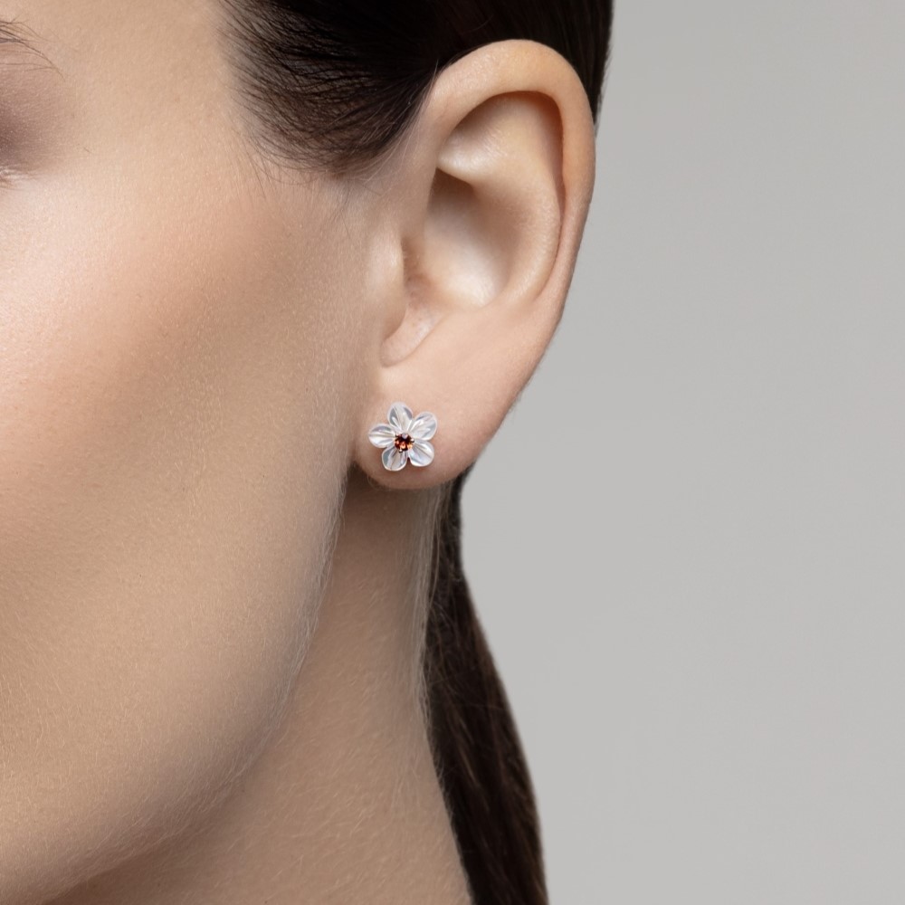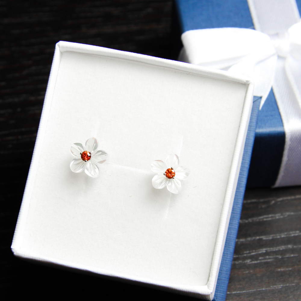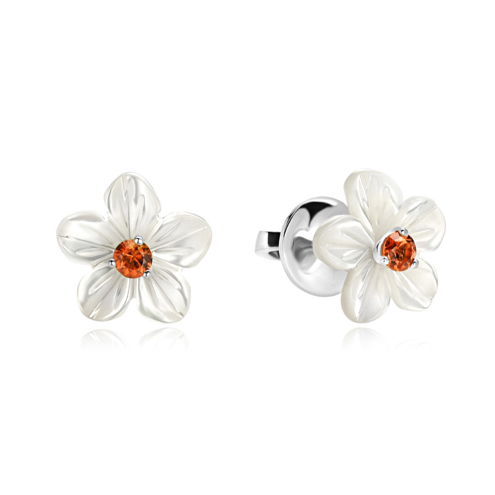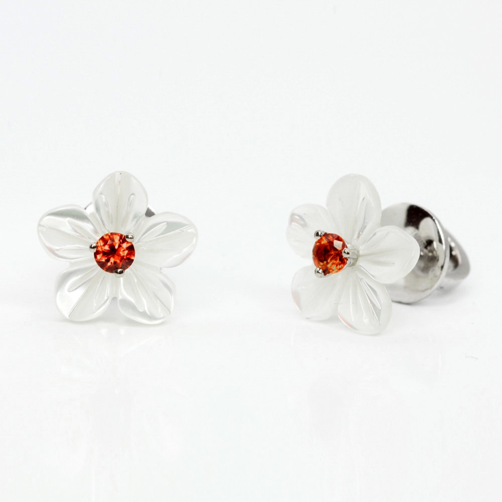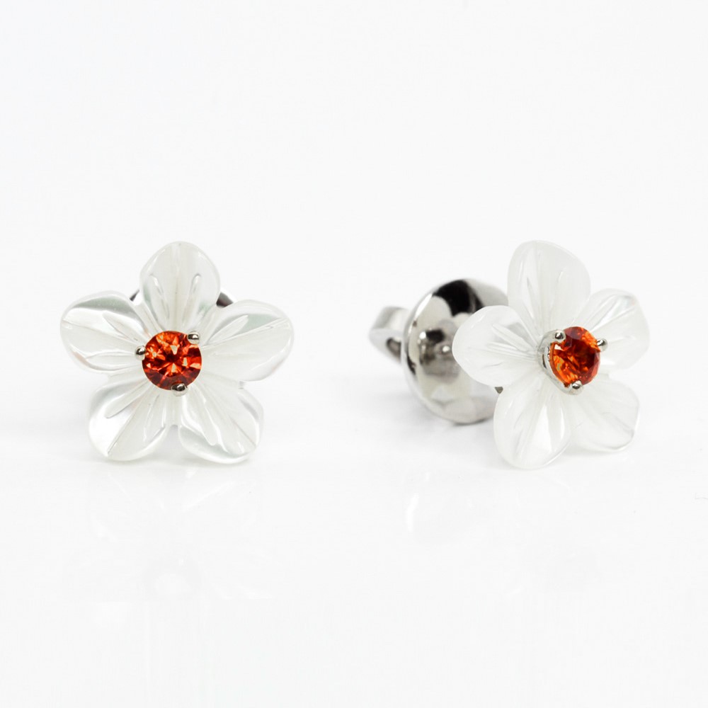 Яркие оранжевые сапфиры, закрепленные в центре цветочков из переливающегося перламутра в серьгах-пусетах из белого золота. Вес серег - 1,7 г. Природный оранжевый сапфир (облагороженный) - Круг - 2 шт. 0,16 карата. Белое золото 585 пробы. Надежный винтовой замок.